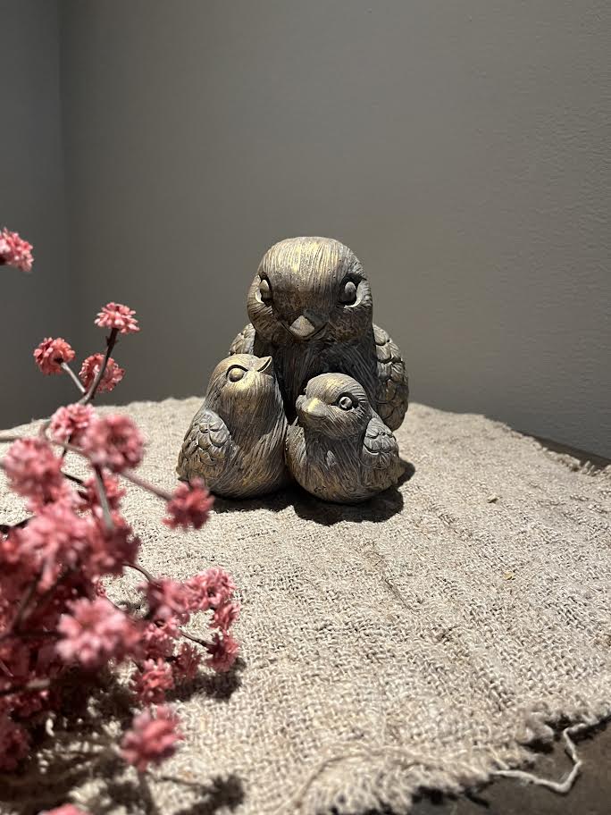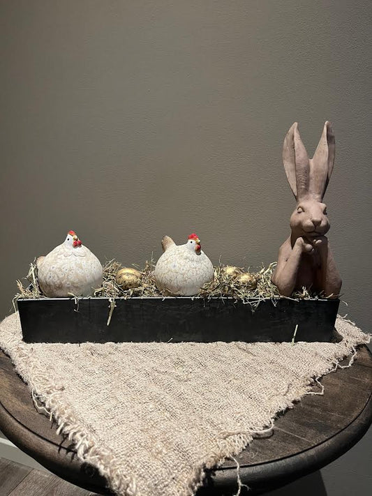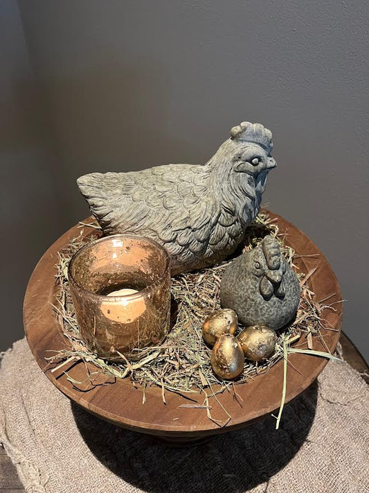 Vensterbank kruk met middel grote kip en 2 kleine kippetjes