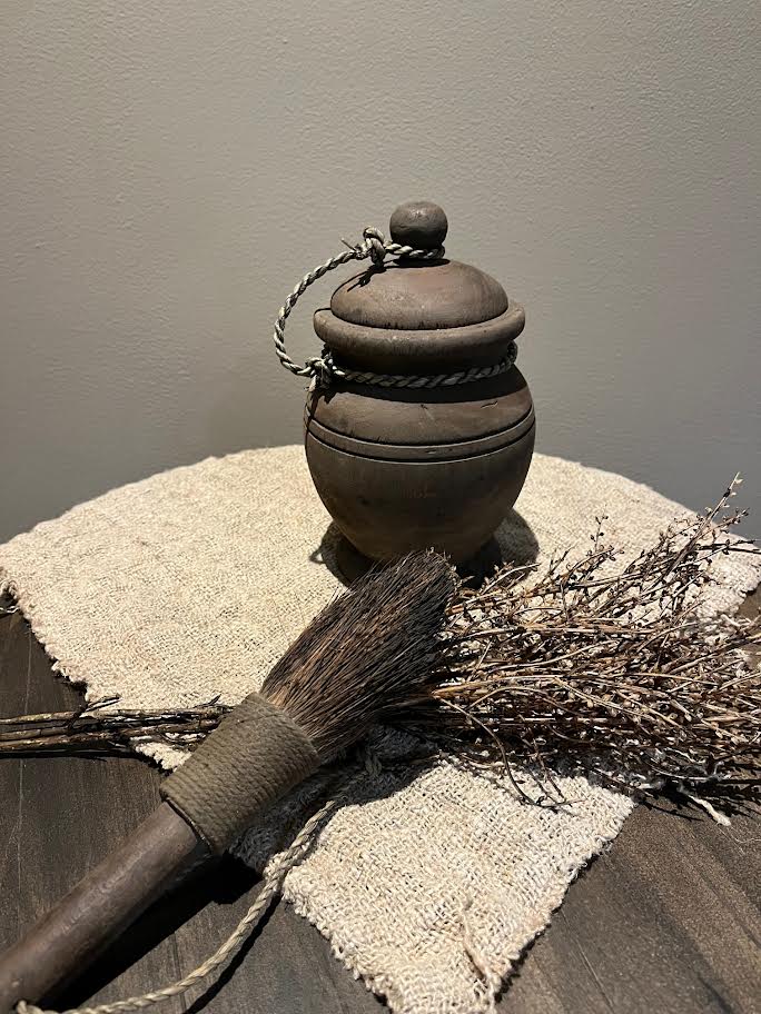 Robuust houten pot met deksel met stoer touw.