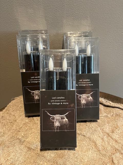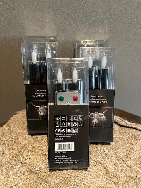 Set van 2 zwarte ledkaarsen 15 cm x 2,2 met afstandsbediening van het merk Vintage & More. De afstandsbediening heeft een timer en dimmer, deze is ook te gebruiken op de stompkaarsen van dit merk. De kaarsen werken op 1 AA batterij (excl)