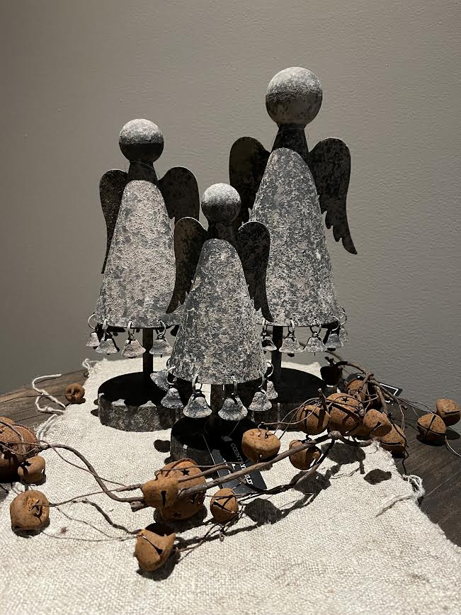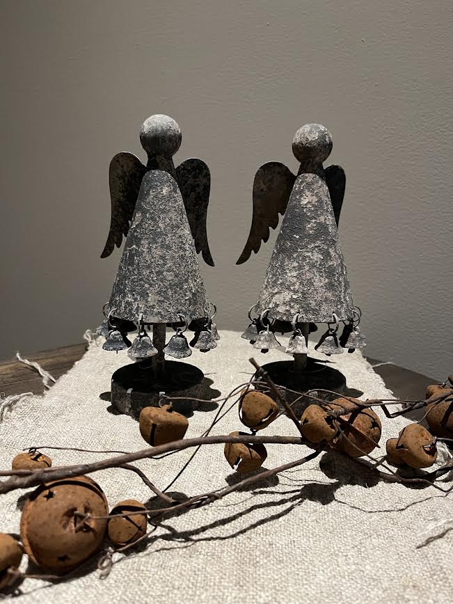 Prachtige stoer sobere engelen van metaal. Onder aan de jurk van de engel hangen belletjes. Prachtig te combineren met andere woonaccessoires.