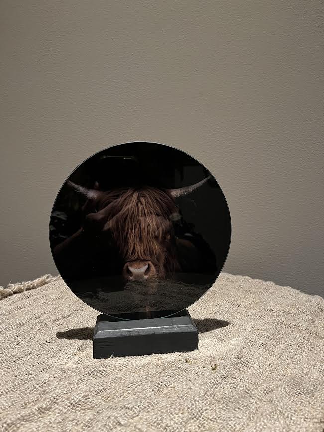 Prachtig rond glasschilderij Bizon. Het glasschilderij kun je niet ophangen. Wordt geleverd met een donker houtje, waar je het glasschilderij in kunt zetten. De achterkant van het glasschilderij is wit.