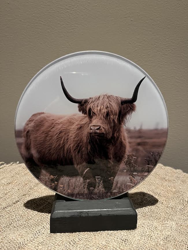 Prachtig rond glasschilderij Bizon. Het glasschilderij kun je niet ophangen. Wordt geleverd met een donker houtje, waar je het glasschilderij in kunt zetten. De achterkant van het glasschilderij is wit.