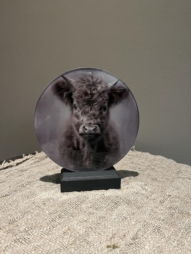 Prachtig rond glasschilderij Bizon donker. Het glasschilderij kun je niet ophangen. Wordt geleverd met een donker houtje, waar je het glasschilderij in kunt zetten. De achterkant van het glasschilderij is wit.