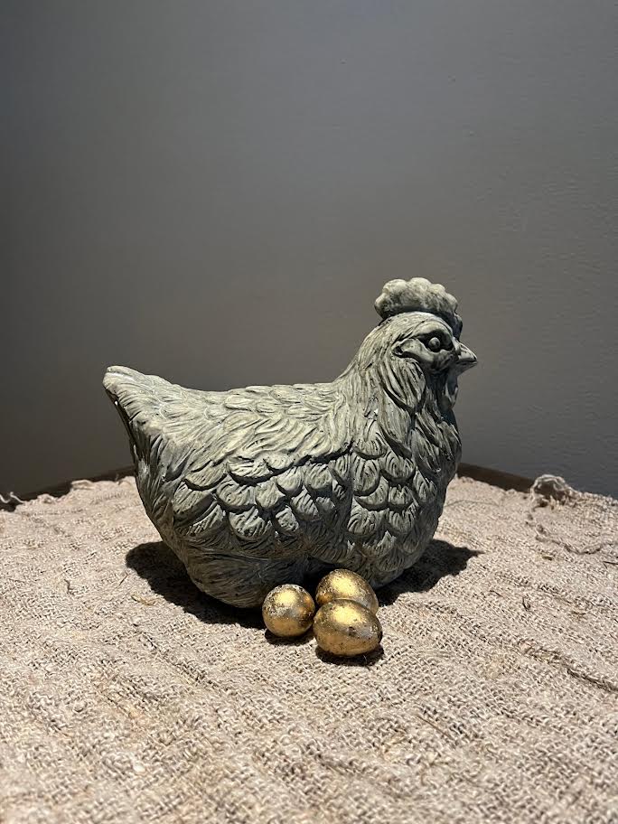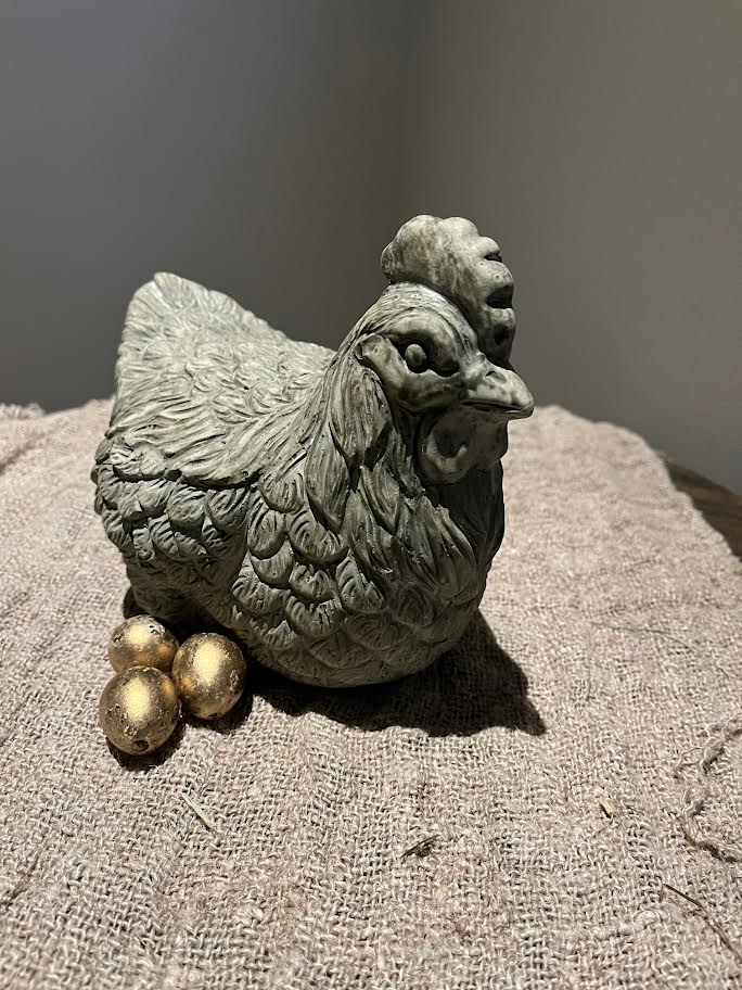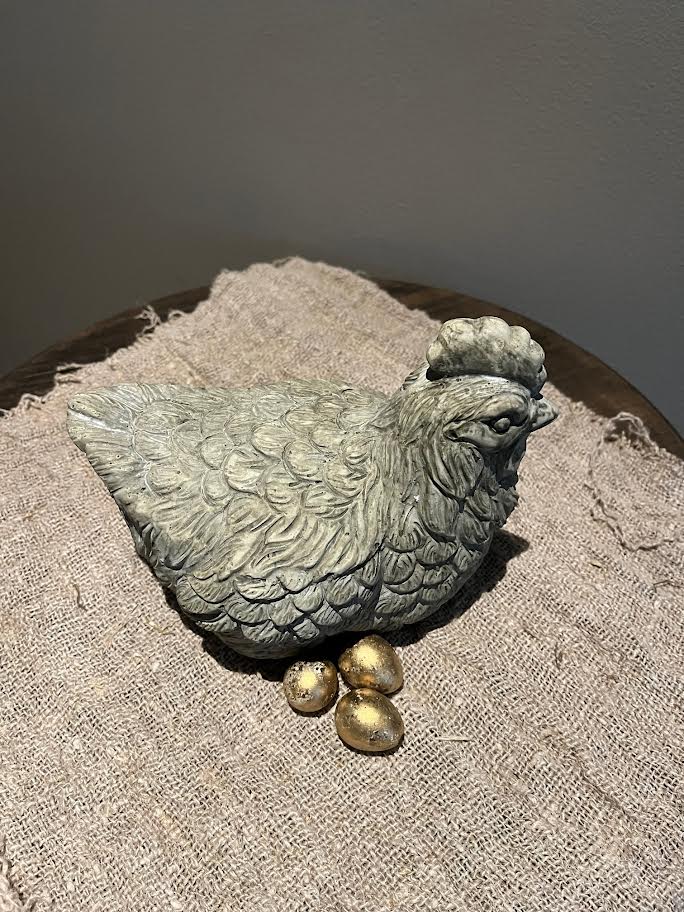 De stenen kip is 16 cm hoog en 21 cm breed.