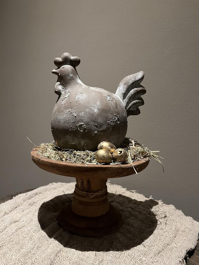 Mooi houten plateau, met hooi en een grote bolle kip bruin, met een aantal eitjes.