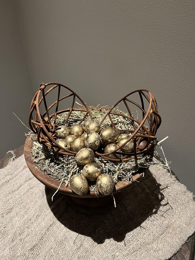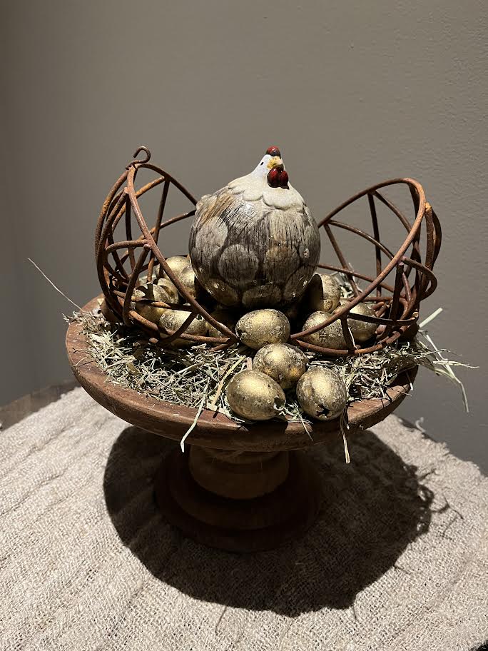 Houten plateau met grote roestbal, waarin een kippetje zit met hooi en eitjes.