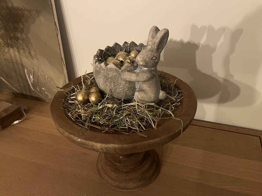 Mooi houten plateau met stenen potje met haas. Het potje is gevuld met een aantal eitjes. Op het plateau ligt wat hooi.