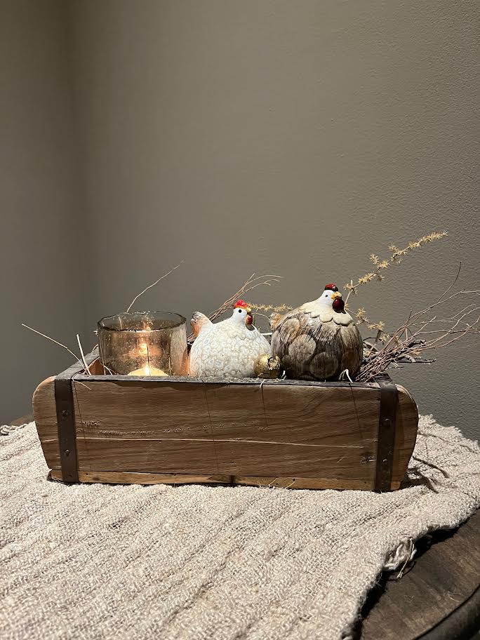 Houten steenmal met 2 kippetjes en waxinelichtje