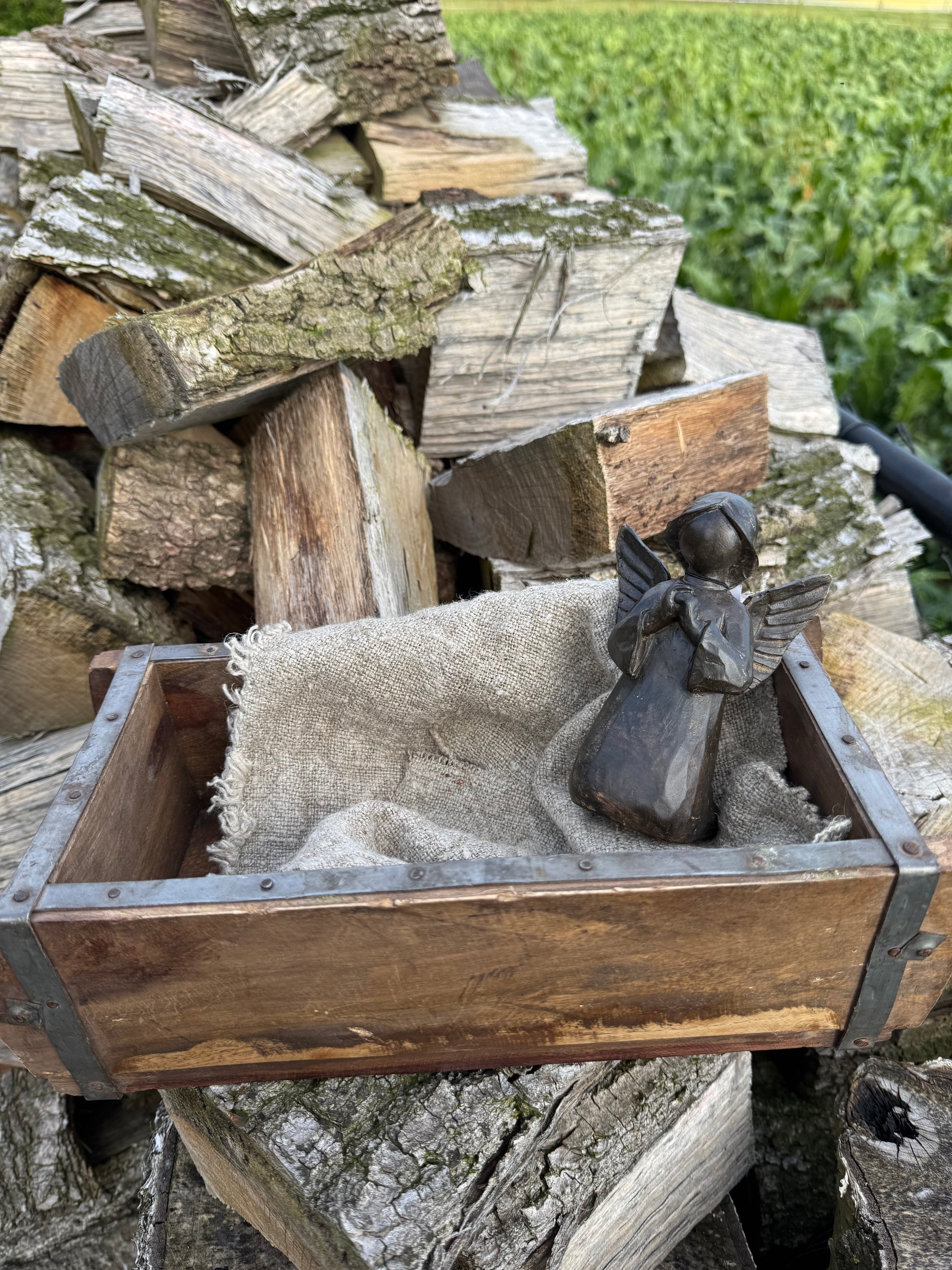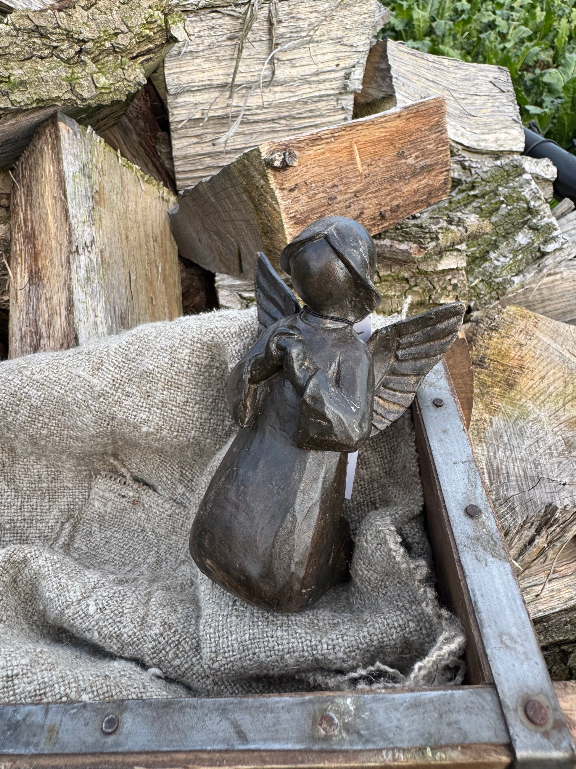 Vervaardigd uit hoogwaardig hout, heeft dit engeltje een sobere en natuurlijke uitstraling. De mooie details van de vleugels en de knielende pose geven het stuk een gevoel van rust en devotie, terwijl de robuuste afwerking een moderne landelijke touch toevoegt aan het geheel.