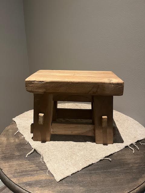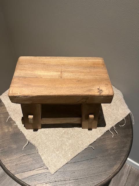 Het houten krukje is 25 cm breed en 19 cm hoog.