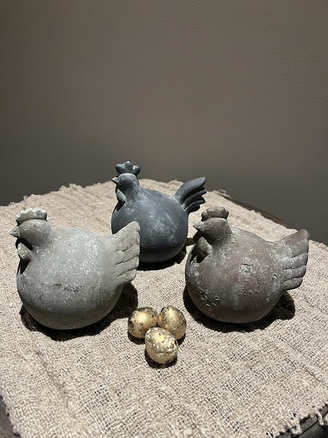 Super leuke betonnen kippen in grijs, bruin of beige kleur verkrijgbaar.