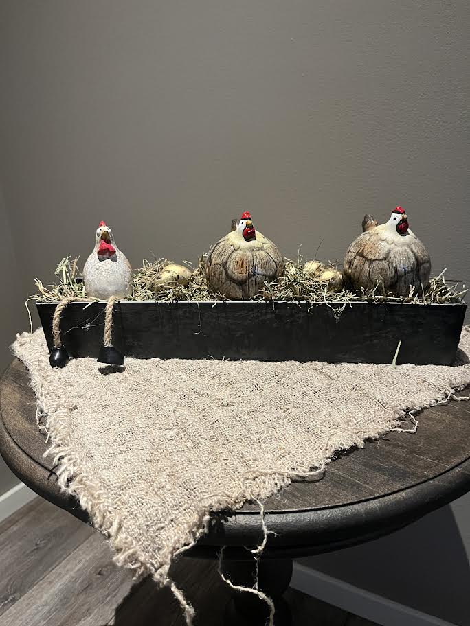 Mooi langwerpige zwart/grijze tray gevuld met hooi en 3 kippetjes en een aantal eitjes.