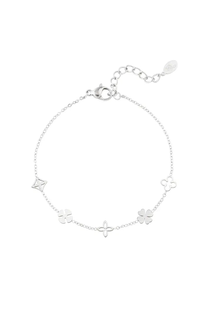 Shop dit te schattige gouden armbandje met vijf leuke bedels waaronder klavertjes en bloemen bij Lofz! Het armbandje is superleuk om te combineren met meerdere leuke armbandjes, maar kan ook los gedragen worden. Tip: draag dit armbandje in combinatie met meerdere sieraden met klavertjesdetails voor een complete look. Het armbandje is gemaakt van roestvrij staal en is te dragen van 16 tot 19 cm. Verkrijgbaar in de kleuren zilver en goud.