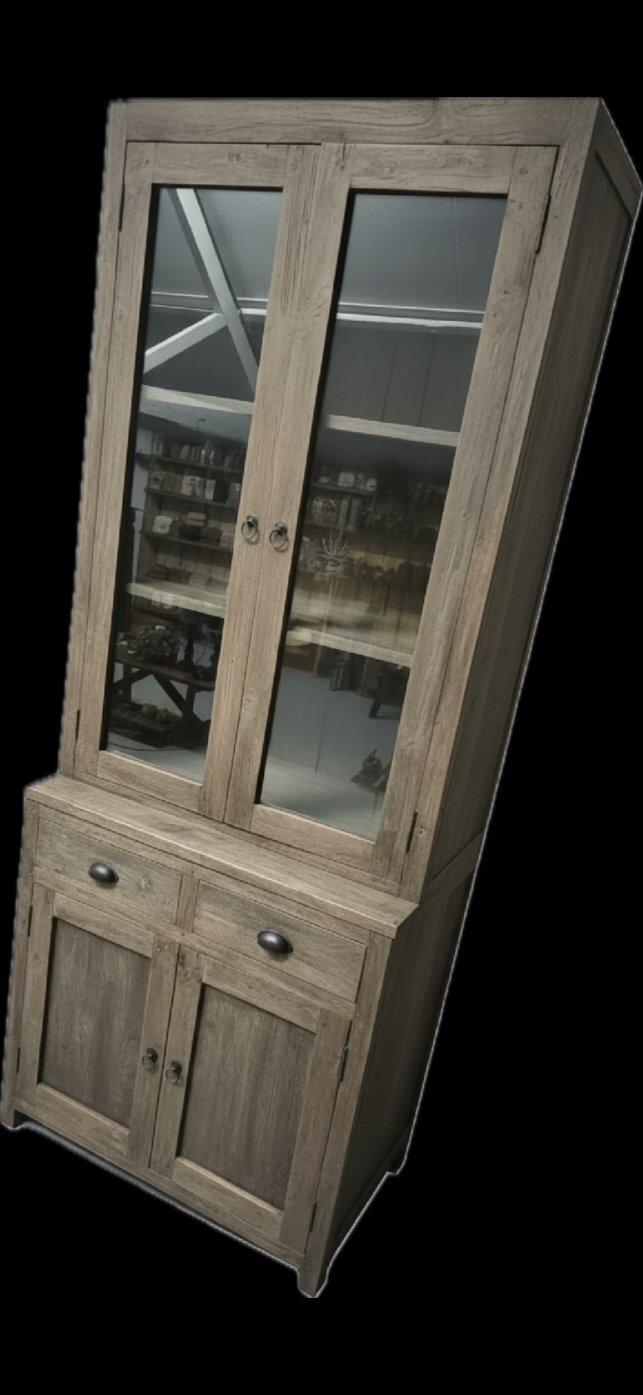 De Luksa vitrinekast Elia is een stijlvolle, rustiek houten kast met twee glazen deuren, die stevigheid en functionaliteit combineert voor een landelijke en tijdloze uitstraling.