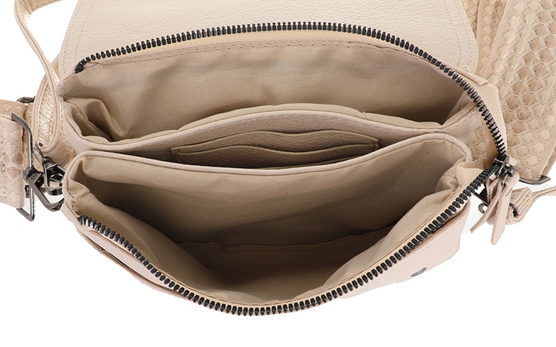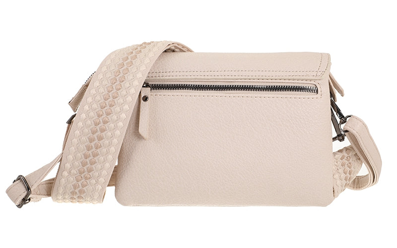 Onder de flap vind je een handig steekvak én een veilige ritssluiting. Die rits opent naar twee aparte vakken, zodat je je essentials overzichtelijk kunt opbergen. Aan de achterkant? Nog een extra ritsvak – perfect voor wat je graag snel bij de hand hebt.