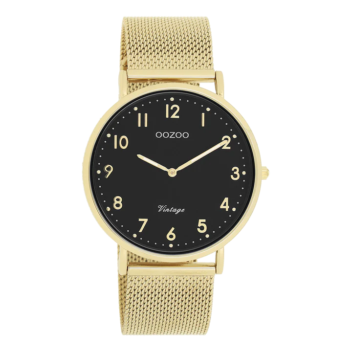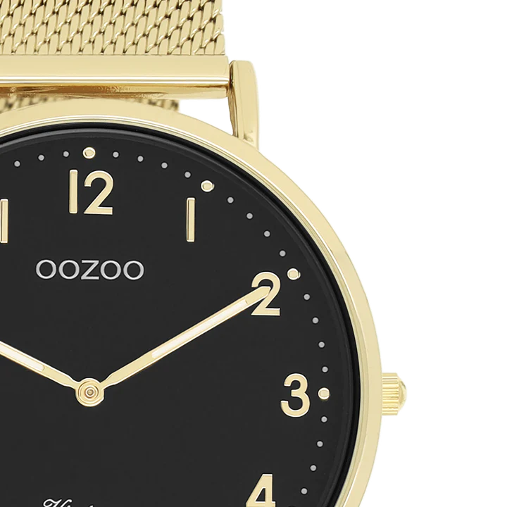 De klassieke look blijft centraal staan in deze trendy serie en daarom is dit OOZOO vintage ronde design met een speelse knipoog dé musthave van het seizoen! Dit unisex horloge is de perfecte combinatie van comfort en fashion met zijn 40 mm goudkleurige metalen horlogekast en zwarte wijzerplaat. De wijzerplaat heeft goudkleurige stippen en cijfers tijdsaanduidingen en bijpassende kleurige wijzers. De goudkleurige metalen mesh armband maakt dit horloge tot een trendy accessoire dat je elke dag kunt dragen. Dit horloge voegt de sprankeling toe aan je outfit. Het mineraalglas ligt in een 6,9 mm dunne metalen horlogekast met IP-plating. De C20344 heeft een stainless steel achterplaat en is nikkel-safe. Dit horloge heeft een 2ATM Japans uurwerk en wordt gedekt door een garantie van 2 jaar.