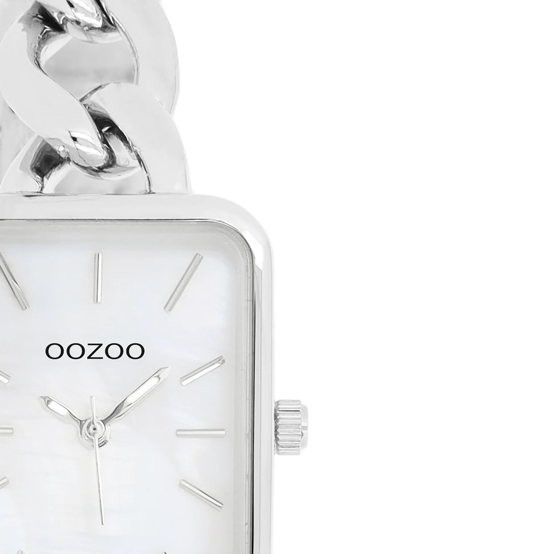 Val op met dit prachtige rechthoekig dames design uit de trendy OOZOO Timepieces collectie. De C11130 heeft een glanzende zilverkleurige schakelarmband en 22,5x28,5 mm zilverkleurige metalen horlogekast. Maak een fashion statement met deze witte parelmoer wijzerplaat, zilverkleurige strepen tijdsaanduidingen en bijpassende wijzers.
