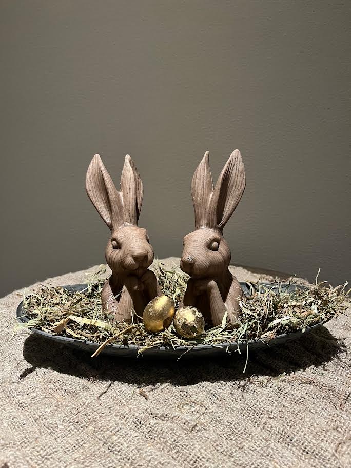 Prachtige ovale tray gevuld met hooi en 2 zen haasjes en eitjes.