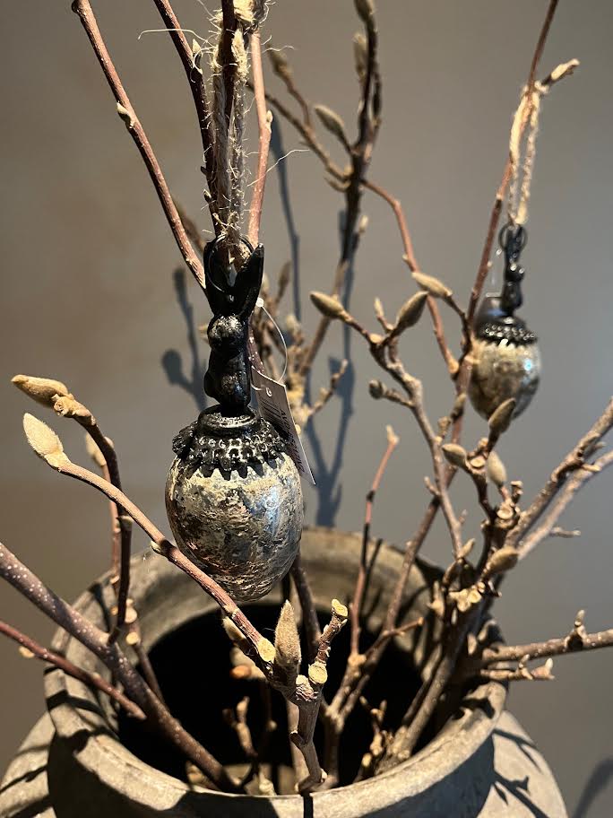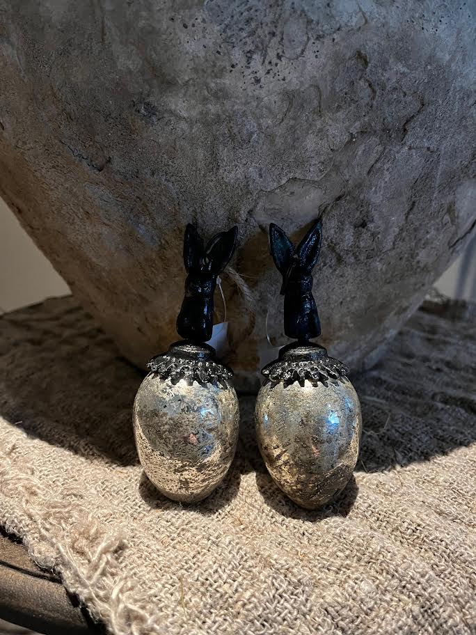Heel stoer paas ei. Het is een zilver ei met stalen haasje eraan vast.