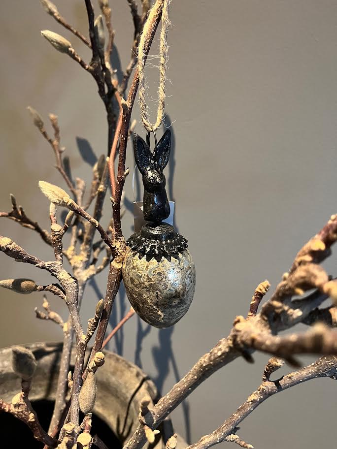Het ei met haasje is 12 cm lang en 4,5 cm breed en kun je ophangen.