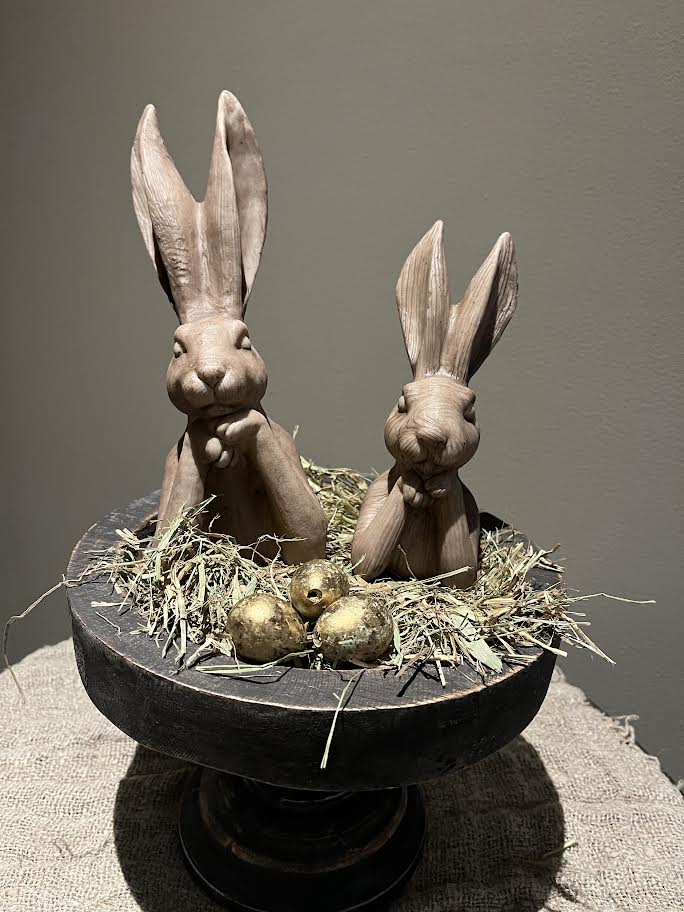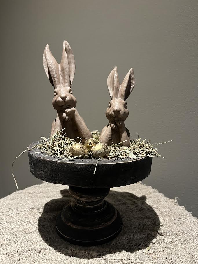 Het betreft een donker plateau, met hooi. Daarop staan Zen haas L en Zen haas met een paar eitjes.