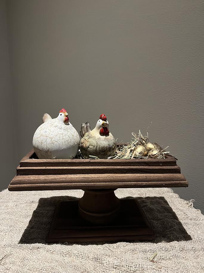 Stoer sober rechthoek plateau met 2 kleine kippetjes erop. Op het plateau ligt hooi en is gedecoreerd met een aantal eitjes.