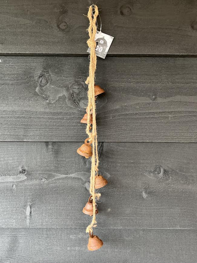 De roest klokjes zijn leuk om te hangen, maar ook mooi om als decoratie neer te leggen. Het touw met roest klokjes is 47 cm lang.