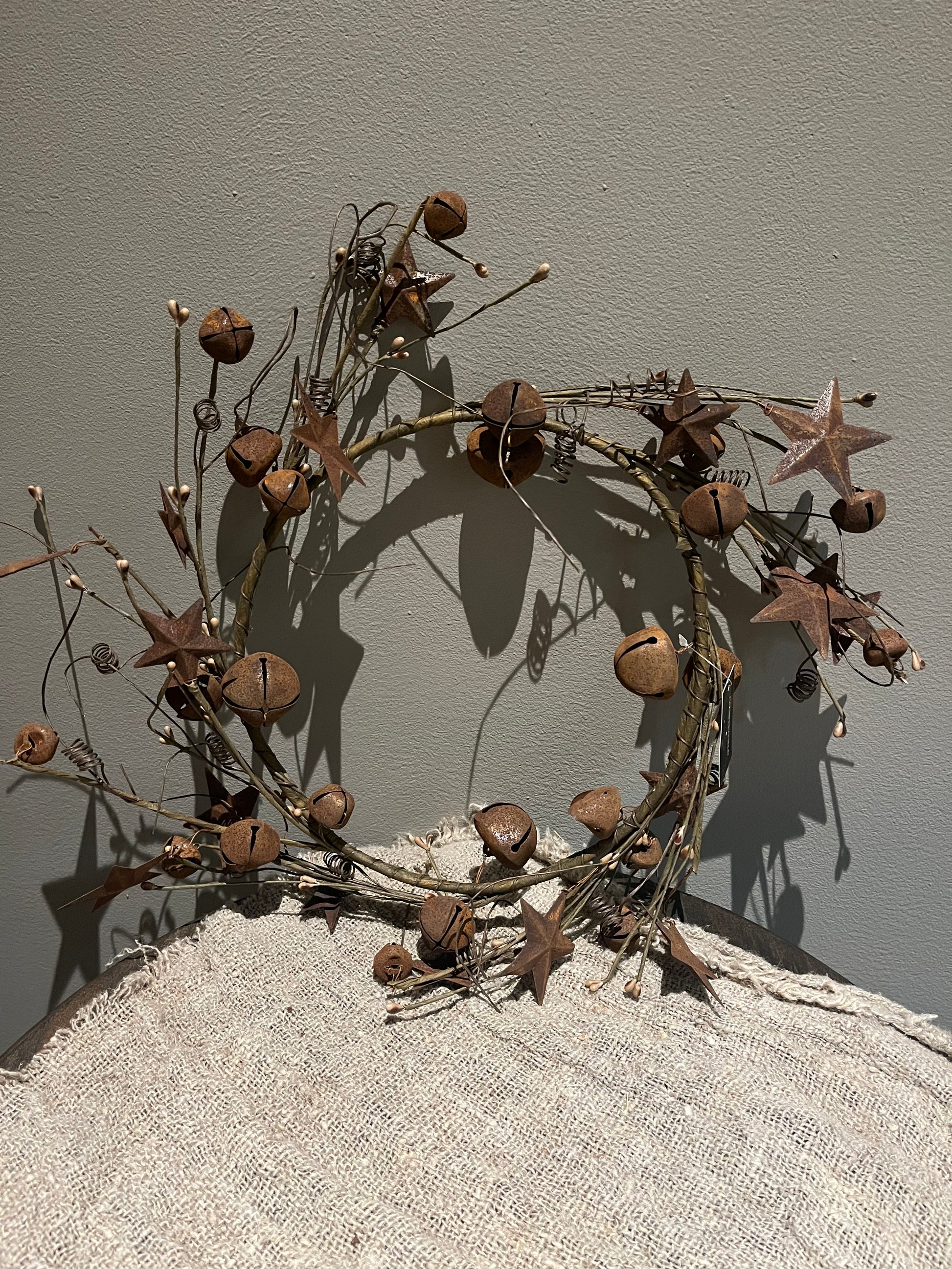 Prachtige roestkrans met sterretjes en belletjes maat L. De krans is leuk neer te leggen rondom een kaars, beeldje, of op een pot neer te leggen. Mooi om op te hangen.