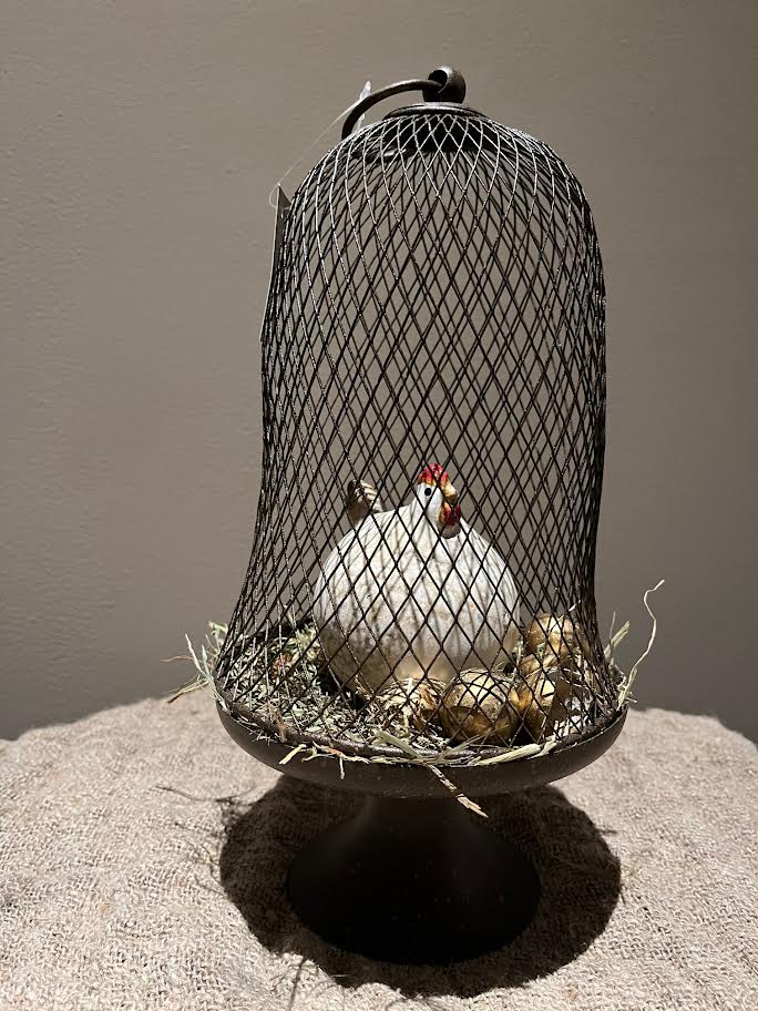 Stoere roest stolp met hooi en een wit kippetje met een aantal eitjes.
