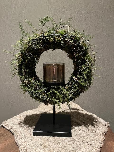 Hele sfeervolle stalen krans met mos gevuld en met asparagus versierd. Er staat een los bubble waxine glaasje in de krans. Mooi om nu al neer te zetten en later eventueel met lampjes te verwerken tegen de kersttijd.
