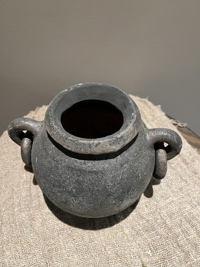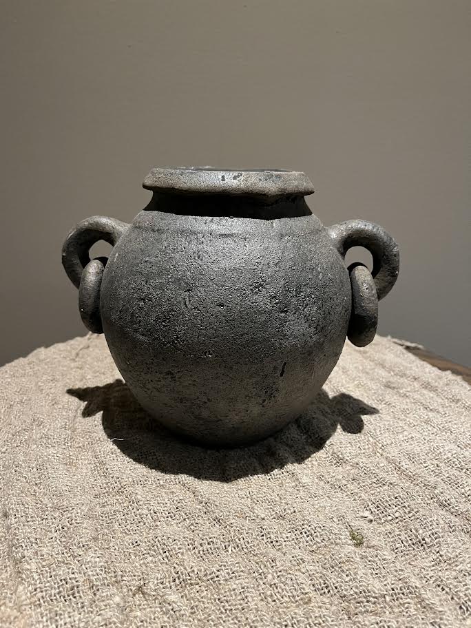 Stoer sobere stenen kruik klein met oren. De kruik is donker grijs/zwart van kleur.