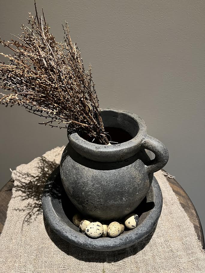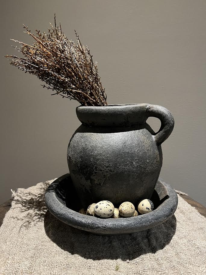 Je kunt de kruik decoreren met een mooie tak. De stenen schaal kun je ook per seizoen leuk opmaken.