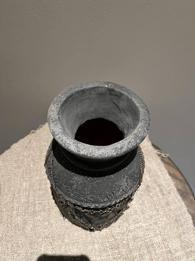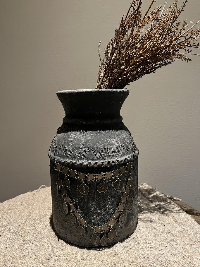De melkbus is mooi te decoreren met een kruikketting, shabbydoek of een mooie tak.