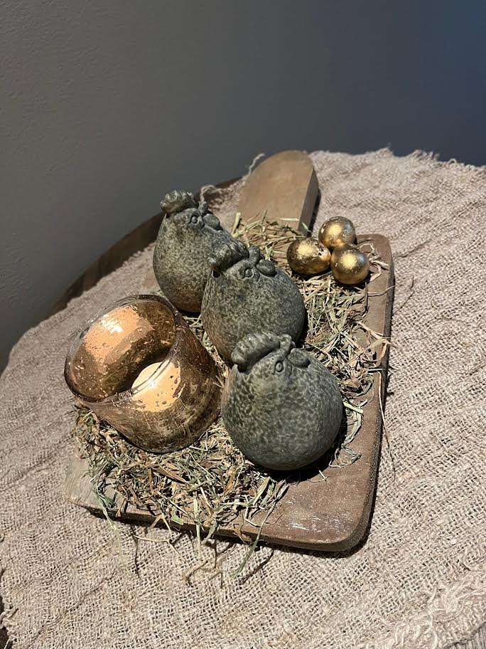 Mooie robuuste old wood tapasplank met 3 kleine kippetjes en bubble glaasje. Op de plank ligt hooi en een aantal eitjes.