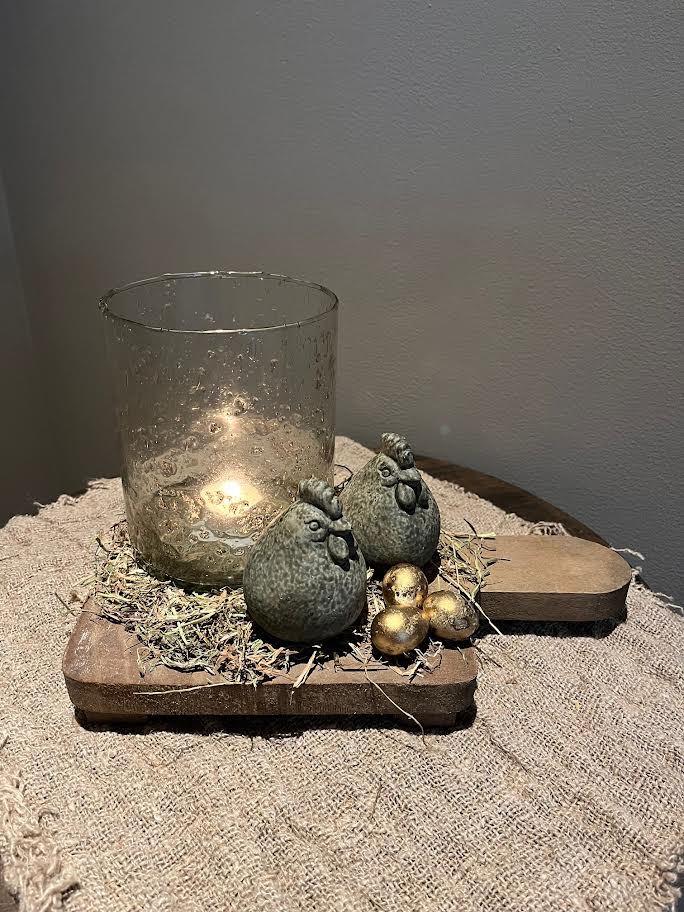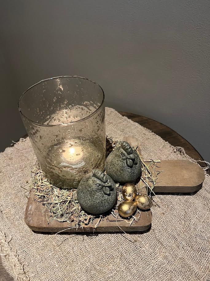 Prachtige robuuste tapasplank old wood. De plank is 21 cm breed en 32 cm lang. De tapasplank is gedecoreerd met 2 kleine kippetjes en groot bubble windlicht. Op de plank ligt hooi en een aantal eitjes.