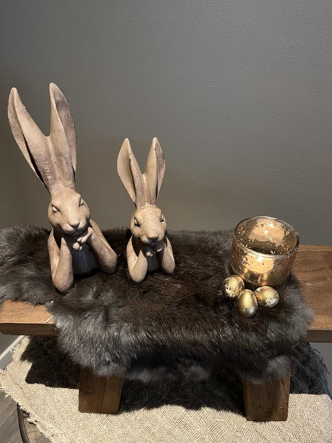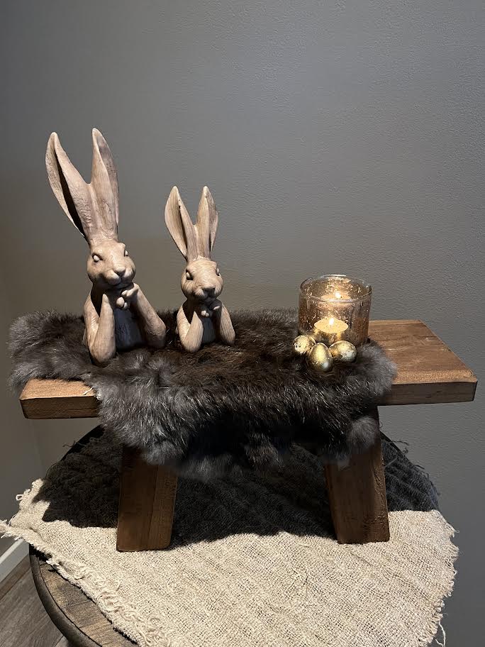 Gave vensterbank kruk met konijnvel. Daarop staan 2 hazen, grote haas Zen en kleine haas Zen. Daarnaast staat er een bubble glaasje op met kleine eitjes.