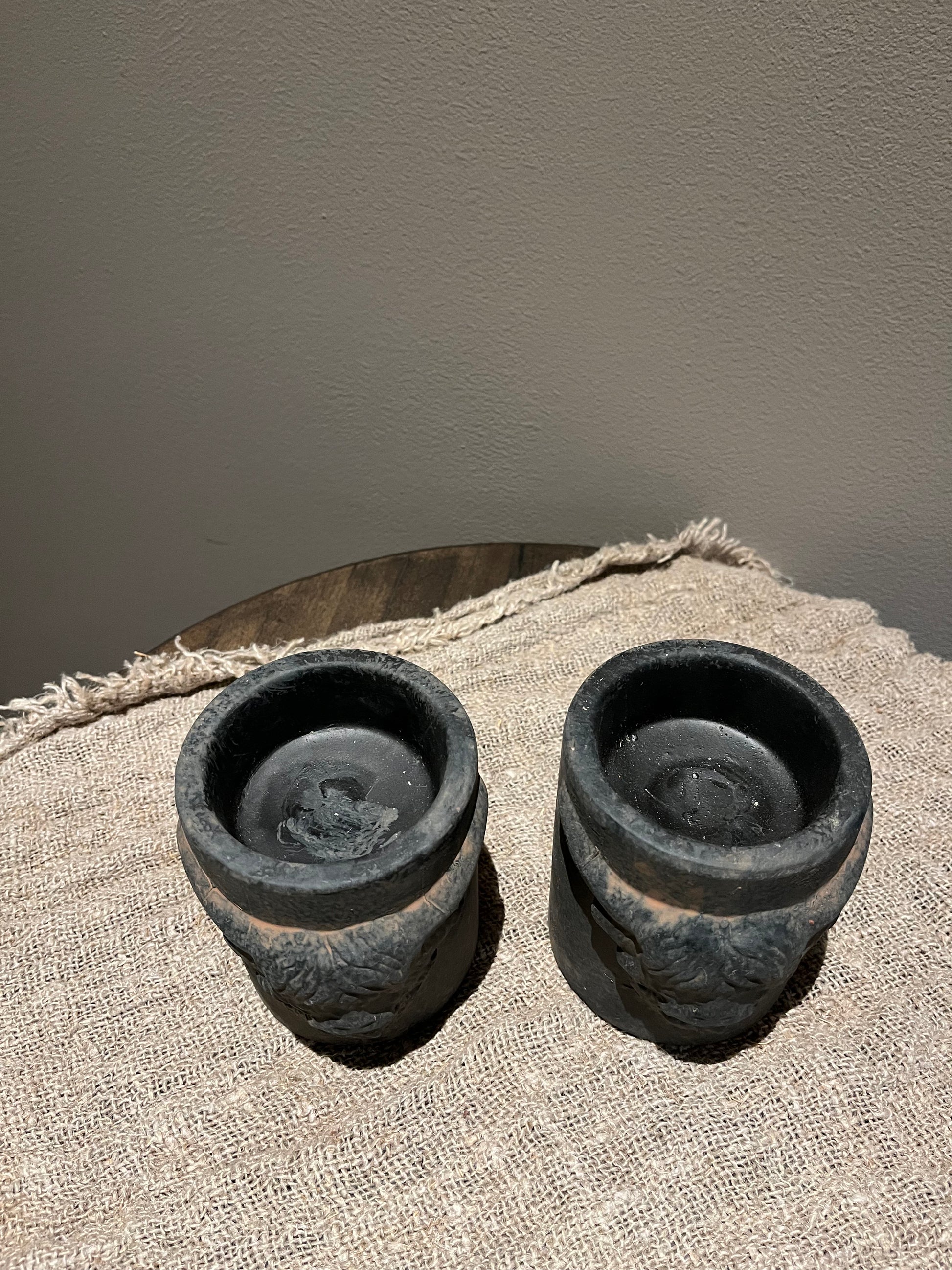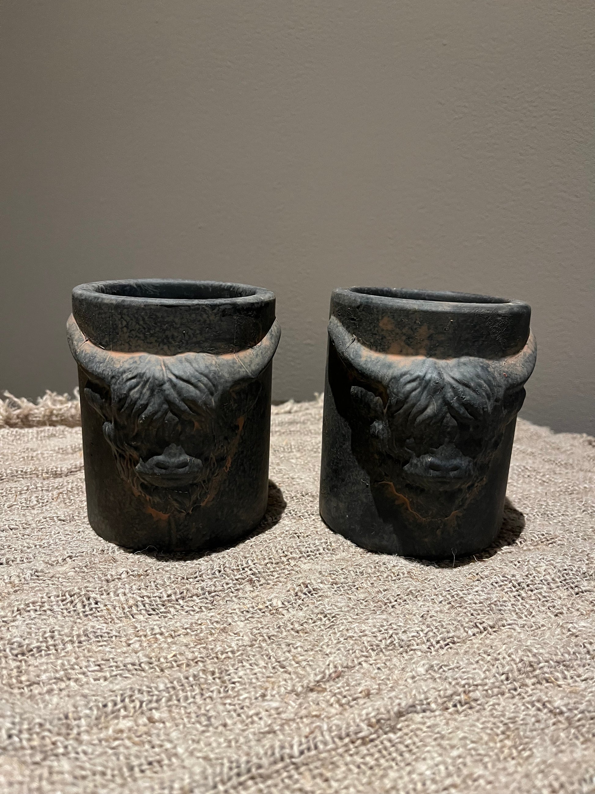 Grijs - zwarte waxinelichthouder met Hooglander. Het is een stenen waxinelichthouder.