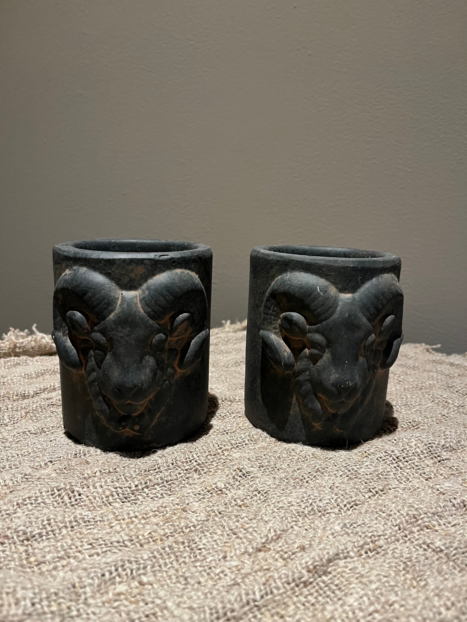 Grijs - zwarte waxinelichthouder met Ram. Het is een stenen waxinelichthouder.